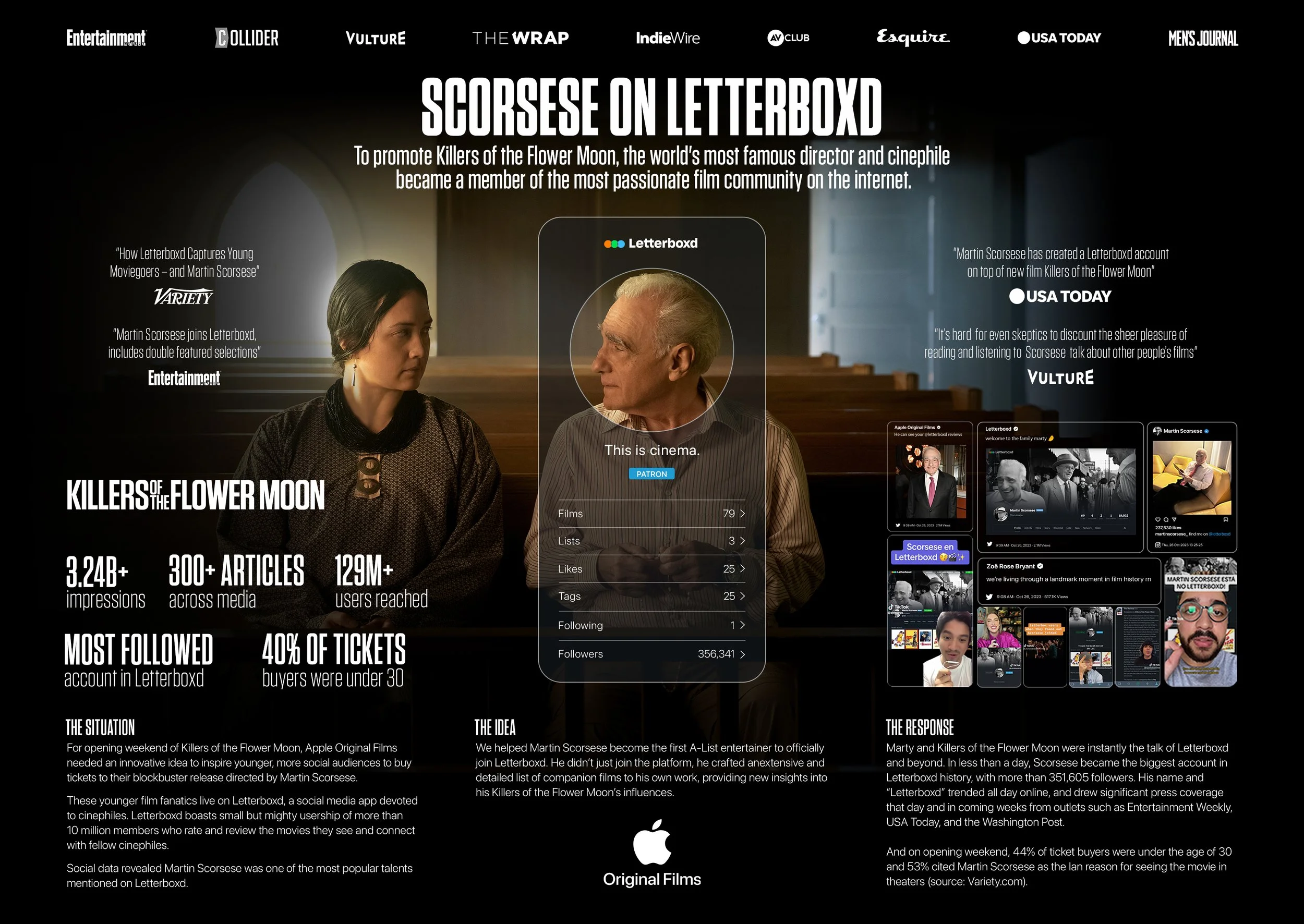 To promote the theatrical release of Killers of the Flower Moon, we worked with the Patron Saint of Cinema to help him join the platform that movie lovers use to log, rate, and review movies.